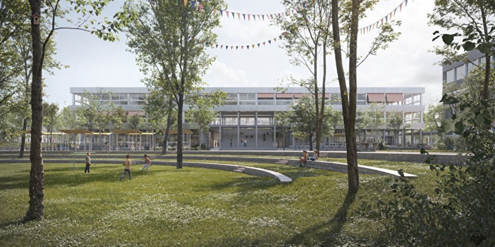 Durch die kompakte Bauweise werden die Aussenflächen freigestellt und als zusammenhängende Grünanlage gestaltet. Unter dem Hof entsteht ein Mehrzwecksaal, im Untergeschoss eine grosszügige Vierfachsporthalle. So entsteht ein funktionaler, kindgerechter und nachhaltiger Lernort, der auch dem Quartier zugutekommt.