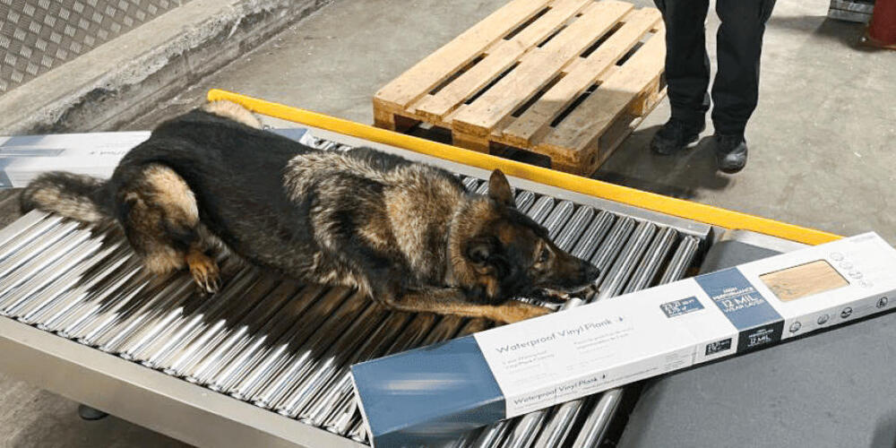 Diensthund Iam half am Flughafen Zürich, 128 Kilogramm Haschisch in einer Frachtsendung sicherzustellen. Die Betäubungsmittel waren in 30 Kartons versteckt. Bild: BAZG